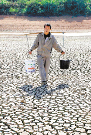 持续晴热水库干 11月4日,一名村民在江西乐平市众埠镇方家村一座几乎干涸的水库底取水。 7月份以来,乐平市出现了少有的持续晴热少雨天气,从8月1日至今的降雨量仅为55.6毫米,旱情十分严重。 新华社发