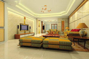 设计说明:在客厅的装饰上设计师选择了米黄色为大体的色,整体的装饰以直线为主局部配合曲线.由于原结构电视背景墙上有一个承重柱设计师以两级装饰造型不仅将建筑上的缺陷给弥补而且无形中加大了电视背景使空间更加大气.电视背景中