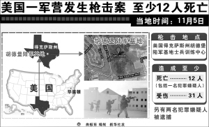 据新华社休斯敦11月5日电(记者陈如为 陈宇)美国得克萨斯州胡德堡陆军基地5日下午发生一名军官开枪行凶的重大枪击案,已造成13人死亡、30人受伤。这是有史以来在美国军事基地发生的最为严重的枪击事件。 这名少校军官的身份已初步查明,他名叫纳达尔·马利克·哈桑,39岁,来自弗吉尼亚州,已服役8年。胡德堡陆军基地发言人此前曾表示,哈桑已在枪击事件中被击毙。但基地指挥官科恩中将后来证实,哈桑只是受了伤,目前在宪兵的看押下,伤情稳定。 据报道,哈桑今年7月份刚从一家军事医疗部门调至胡德堡陆军基地担任心理健康专家。有消息称,哈桑正被考虑派往海外,目的地可能是阿富汗。哈桑开枪行凶的动机目前尚不清楚。 科恩中将在新闻发布会上说,除一名警察外,死者基本都是军人。伤者已被送往得克萨斯州中部的几家医院抢救。 枪击事件发生后,该基地已经被关闭。现场电视报道画面显示,基地一带有大批全副武装警察在巡逻,不时传来刺耳的警笛声。有消息说,美国本土其他军事基地随即提高了戒备等级。 美国总统奥巴马当天对胡德堡陆军基地重大枪击案表示震惊,称这起事件是“可怕的暴力大爆发”。奥巴马说,这起事件的受害者都是保卫国家安全的军人,“在海外战场失去这些勇敢的美国人时,我们已很难接受。看到他们在美国的土地上、在军事基地遭到枪击,让人感到可怕”。 胡德堡陆军基地位于得克萨斯州中部,占地339平方英里,因约翰·贝尔·胡德将军而得名。该基地于1942年9月18日投入使用至今。许多派往海外的美军官兵和从海外奉调回国的美军官兵,出国前和回国后都在胡德堡陆军基地接受3到6个月的培训。 |