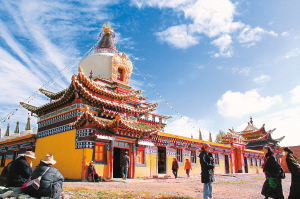 格尔登寺就在县城边上,据说常驻的喇嘛有3千人左右。一般喇嘛都是自己吃住,寺院平时并不负责提供吃住,只是不定期发放善众捐赠的钱财,平均分配。整个寺院金光闪闪,在所有可以贴的地方都是黄金,在灿烂阳光的照耀下,无比辉煌。转经筒围绕了整个寺院。