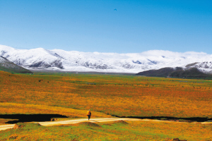 雪山、蓝天、草地、无尽头的路,一个人的旅程。