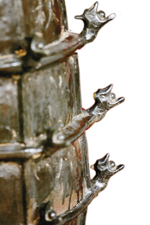 10月3日下午,当这尊黑灰光润的佛塔摆在丘小君的鉴宝案台上时,大家的眼睛为之一亮:它高约76厘米,呈六面形,胎质灰黑坚硬,黑釉均净光亮;塔作五级上置葫芦形顶,底有封闭,一侧开有五个佛龛式窗,正檐上塑有含珠龙首;塔身自上而下刻有“礼奉佛塔”、“千秋万代”、“风调雨顺”、“恩泽子孙”等文字。