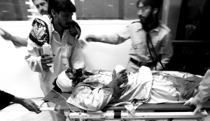 11月8日,救援人员运送伤者到达巴基斯坦西北边境省首府白沙瓦的一家医院接受治疗。当天发生在该省首府白沙瓦的自杀式爆炸袭击已造成至少10人死亡,20余人受伤。塔利班宣称负责。 新华社/路透