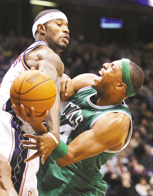 | 凯尔特人队皮尔斯(右)遭网队威廉姆斯阻挡。 新华社发 |