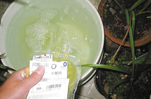 “看看我的肥料哈!高蛋白的营养品哦!”11月7日,在某网络论坛中,名为“来来回回”的网友图文并茂地描述了他用血浆兑水浇灌兰花的过程。网帖照片中,在血浆袋上可以清楚地看到“成都市血液中心”字样,以及血浆编号、献血者编号、采血日期(2009.10.03)和失效日期(2014.10.03)等信息。论坛资料显示,该网友来自成都。