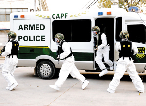 11月10日,武警战士在连云港市宿城乡演习现场对重要目标加强警卫。当日,国家核应急协调委员会举行首次国家核事故应急演习,以检验中国核应急预案及执行程序的有效性。此次演习模拟田湾核电站2号机组一回路主管道发生泄漏,放射性物质向环境释放。 新华社发(耿玉和 摄)