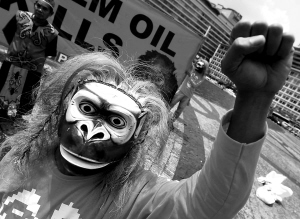 11月12日,在印度尼西亚首都雅加达,来自印尼加里曼丹岛的一个猩猩保护中心成员头戴猩猩面具参加抗议活动,要求人们拯救猩猩。 新华社发