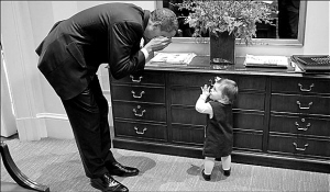在美国总统奥巴马就职一周年之际,白宫日前公开了一些奥巴马的罕见生活照,其中一张照片中,奥巴马竟与小孩儿玩起了“躲猫猫”(下图)。 这张照片拍摄于2009年10月30日,拍摄地点是白宫椭圆形办公室的外面。当时,奥巴马忙里偷闲走出办公室,碰见了总统就职委员会(PIC)执行主任贝里佛的女儿麦薇。当时小姑娘正独自玩耍,而已经有了两个女儿的奥巴马一时父爱大发,和小姑娘玩起了“躲猫猫”(peek-a-boo)。奥巴马用手遮住脸,然后忽然松开逗麦薇,麦薇乐得咯咯大笑。 (国际在线)