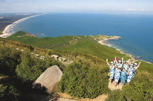 11月12日,来自云南的游客在美丽的文昌铜鼓岭上留影。看着眼前的美景,她们情不自禁地齐声高呼:太美了!太美了!她们说,是因为知道龙楼镇要建航天项目,才特意来看看,没想到这里风景竟然这么美! 本报记者 王凯 摄