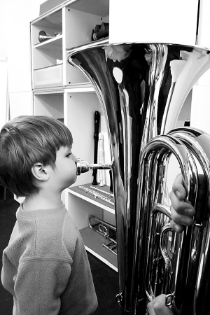 11月12日,一名德国儿童在首都柏林“响叮当”博物馆试吹低音号。这家特殊的博物馆专门从事专业音乐启蒙教育。当地儿童在这里可以在专业乐手的辅导下自己试着演奏各种专业乐器。