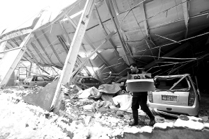 由于连降大雪,郑州市二手车交易市场一展厅被大雪压塌,10余辆轿车被砸。 新华社发