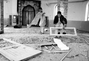 11月13日,两名阿富汗儿童在喀布尔的一座清真寺清理被震坏了的门窗。当日,位于阿富汗首都喀布尔的一个北约军事基地遭到炸弹袭击。 新华社发