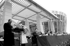 11月14日,在联合国工业发展组织国际太阳能技术促进转让中心大楼竣工典礼现场,联合国工业发展组织总干事坎德赫·云盖拉(左一)在讲话。