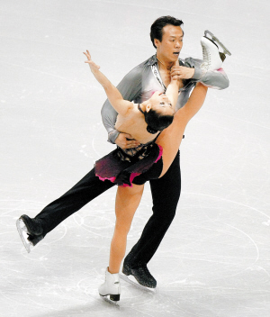 14日,在2009世界花样滑冰大奖赛美国站双人滑短节目比赛中,中国选手申雪/赵宏博以74.36分的成绩位列第一。图为申雪/赵宏博(上)在比赛中。 新华社发