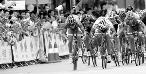 | 15日,车手在向澄迈赛段终点冲刺。 本报记者 宋国强 摄 |