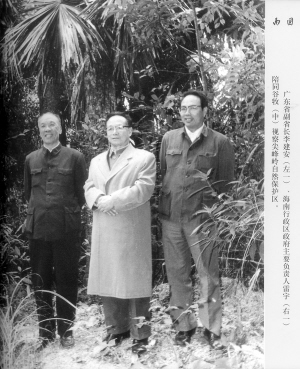 | 广东省副省长李建安(左一)、海南行政区政府主要负责人雷宇(右一)陪同谷牧视察尖峰岭自然保护区。周可斌 摄 |