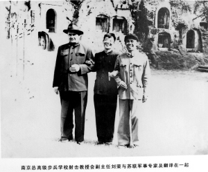 | 总高级步兵学校射击教授会副主任刘荣(右)与苏联军事专家及翻译在一起。