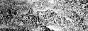 明安先生画虎,惟妙惟肖,他笔下的虎,或奔或卧,或静或动,或聚或散,或斗或和,形态各异,神形兼备,具王者之风;其中最为精品的画作应首推“百虎图”长卷,该画作纵49厘米,横835厘米,于2005年完成。周明安在画作中有意识强化虎的情趣和灵性,以情驱笔,心手相印,笔墨洗练而自然。既继承了文人画的笔墨表现形态,又成功地将唐宋艺术所崇尚的大气风韵输入笔墨之中,气足韵丰。百虎图被画界誉称为“传世典藏”。