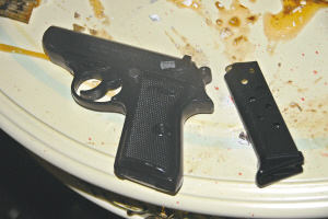 ↑ 警方在案犯作案现场缴获的仿制真手枪及“六四”子弹。 新华社发