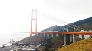 这是西堠门大桥。 舟山群岛连接大陆的连岛工程包括5座跨海大桥,其中两座跨海大桥———西堠门大桥和金塘跨海大桥现已建设完成,是目前中国规模最大的陆岛联络工程。 新华社发