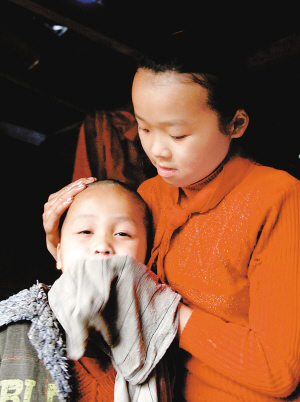11月5日,吴慧春为5岁的弟弟吴慧封洗脸。 新华社发