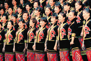 ↑11月18日,首届中国南方(海口)合唱艺术周开幕式在海口市人大会场举行。海南爱乐女子合唱团演唱黎族民歌《叫侬唱歌侬就唱》。 本报记者 李幸璜 摄