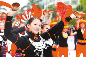 ←十一月十九日上午,在儋州市举行的“欢乐世界”大巡游活动上,演员表演海南民族舞蹈。 本报记者 苏晓杰 摄