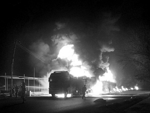 11月21日,在阿富汗北部昆都士省的路上,阿富汗消防员向一辆燃烧的油罐车喷水灭火。三辆向美军和北约盟国军队供油的油罐车遭到火箭弹袭击,燃烧起火。 新华社/法新