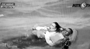 | 电视截图照片显示,在靠近新加坡的卡里摩岛附近,两名遇险乘客在海上等待救援。 新华社/法新 |