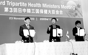11月23日,在日本东京举行的第三届中日韩卫生部长会议上,中国卫生部长陈竺、日本厚生劳动大臣长妻昭与韩国保健福祉家庭部长官全在姬(从左至右)签署《中日韩三国关于食品安全的合作备忘录》。当天,第三届中日韩卫生部长会议在东京举行。会议发表了《第三届中日韩卫生部长会议共同声明》,在防控甲型H1N1流感、药物临床研究、灾害医学和食品安全等领域达成多项共识。 新华社发