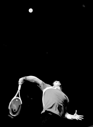 | 11月24日,在伦敦进行的2009年ATP世界巡回赛总决赛男单B组首轮比赛中,塞尔维亚选手德约科维奇以2:1击败俄罗斯选手达维坚科。图为德约科维奇发球。 新华社发 |