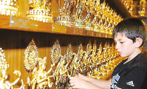 2006年5月,鲁斯兰(右)在三亚练习中国书法(上图);在三亚接受针灸治疗(中图);在南山寺游览(下图)。新华社发