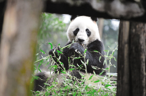 11月27日,生活在中国保护大熊猫研究中心雅安碧峰峡基地的两只大熊猫“网网”和“福妮”,将前往澳大利亚阿德莱德动物园,开始为期10年的生活。图为“网网”在雅安碧峰峡基地。 新华社发