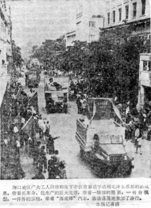 1970年10月1日,海口工人乘着“海南牌”汽车,参加海口地区军民庆祝新中国成立21周年游行。