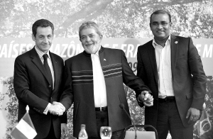 11月26日,在巴西马瑙斯,法国总统萨科齐(左)、巴西总统卢拉(中)和圭亚那总统贾格迪奥在峰会上握手。当日,亚马孙地区国家和法国气候峰会在马瑙斯召开。与会国家领导人将为12月在丹麦哥本哈根召开的联合国气候大会协调立场。 新华社/法新