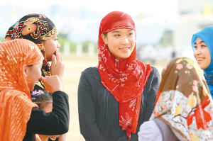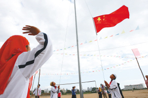 → 11月27日上午,三亚身着节日盛装的穆斯林群众以传统方式庆祝古尔邦节。古尔邦节又称宰牲节,是穆斯林群众的两大传统节日之一。 ↓ 三亚回族学生升国旗庆节日。 本栏照片均由特约记者 孙清 摄