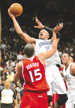北京时间27日,NBA常规赛只进行两场比赛,结果老鹰76:93负于魔术,爵士105:86胜公牛。图为魔术队卡特(上)上篮。 新华社发
