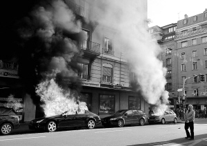 11月28日,在瑞士的日内瓦,一名男子经过被示威者点燃的汽车。瑞士日内瓦28日发生的抗议世界贸易组织的游行活动演变成暴力事件,部分游行者砸毁商店橱窗、点燃汽车,最后与防暴警察发生冲突。 新华社/法新