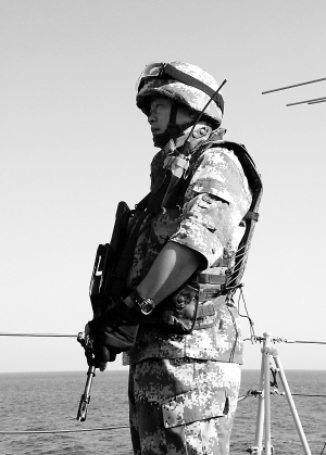 中国第四批护航编队完成首批护航任务 11月29日, "观音"、"福杰"、"斯格特6"等12艘中外船舶在"马鞍山"舰的护送下安全抵达亚丁湾东部预定海域。中国海军第四批护航编队首批护航任务圆满完成。图为中国海军特警队员在舰上警戒。 新华社发