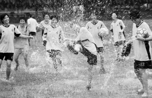| 训练之余,女足姑娘们在雨后的操场上打起了水仗。 |