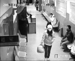 | ↑这是11月20日西安交通大学第一附属医院监控录像拍摄的犯罪嫌疑人“偷婴”前的截图。