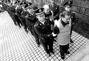 | 12月1日,团伙成员被押进法庭(第一排中陈知益,第二排中为邓宇平)。 新华社记者 陈诚 摄
