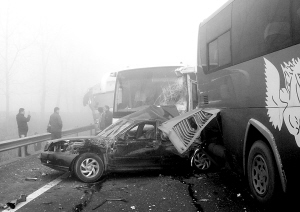 至少3死8伤 12月1日,事故现场车辆被毁严重。 当日清晨7时45分至8时15分许,受团雾影响,宁连公路南京高速段连云港至南京49至51公里处,连续发生3起交通事故,第一起造成2人死亡、第二起造成1人死亡,第三起造成8人受伤。目前伤者已被送往医院救治。 新华社发(叶方龙摄)