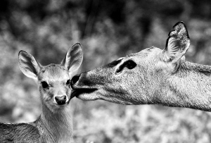 2005年12月4日,海南大田国家级自然保护区内,坡鹿舔犊情深。 本报记者 宋国强 摄