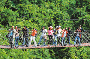 12月1日,18省市影友海南摄影采风团的摄影师们,在三亚市亚龙湾热带天堂森林公园160米长的雨林吊桥上激情创作。 本报记者 王凯 摄