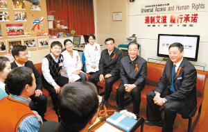 | 这是温家宝、李克强在位于地坛医院的北京红丝带之家与艾滋病患者(两位、背影)、志愿者及医护人员交谈。 新华社记者 庞兴雷 摄 |