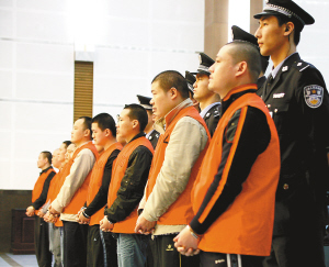 2009年10月21日,重庆“打黑大审判”第一案宣判,杨天庆(前排右一)等人在庭审现场。