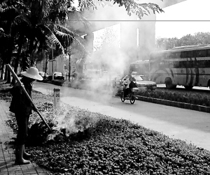 | ↑12月6日上午10时,一名工人在海口南海大道亚豪建材广场前的绿化带上焚烧垃圾。