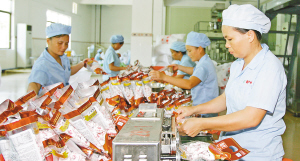 | 文昌春光食品有限公司工人正在包装椰子糖成品。