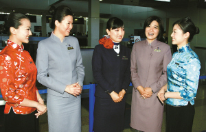 12月7日,东方航空公司和台湾“中华航空公司”启动为期1个月的空乘人员集体交流活动,这是海峡两岸航空界首次在空中服务领域进行交流合作。活动期间,东航和华航将每天派出一名空乘人员,观摩对方航班的服务流程,并在航班上和旅客沟通,借鉴学习对方的服务经验。 新华社记者裴鑫摄